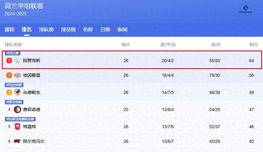 阿贾克斯目前领先埃因霍温6分,如果他们能在这场“6分大战”中获胜,并将领先优势扩大至9分,那么剩余赛季夺冠的可能性将高达97%。