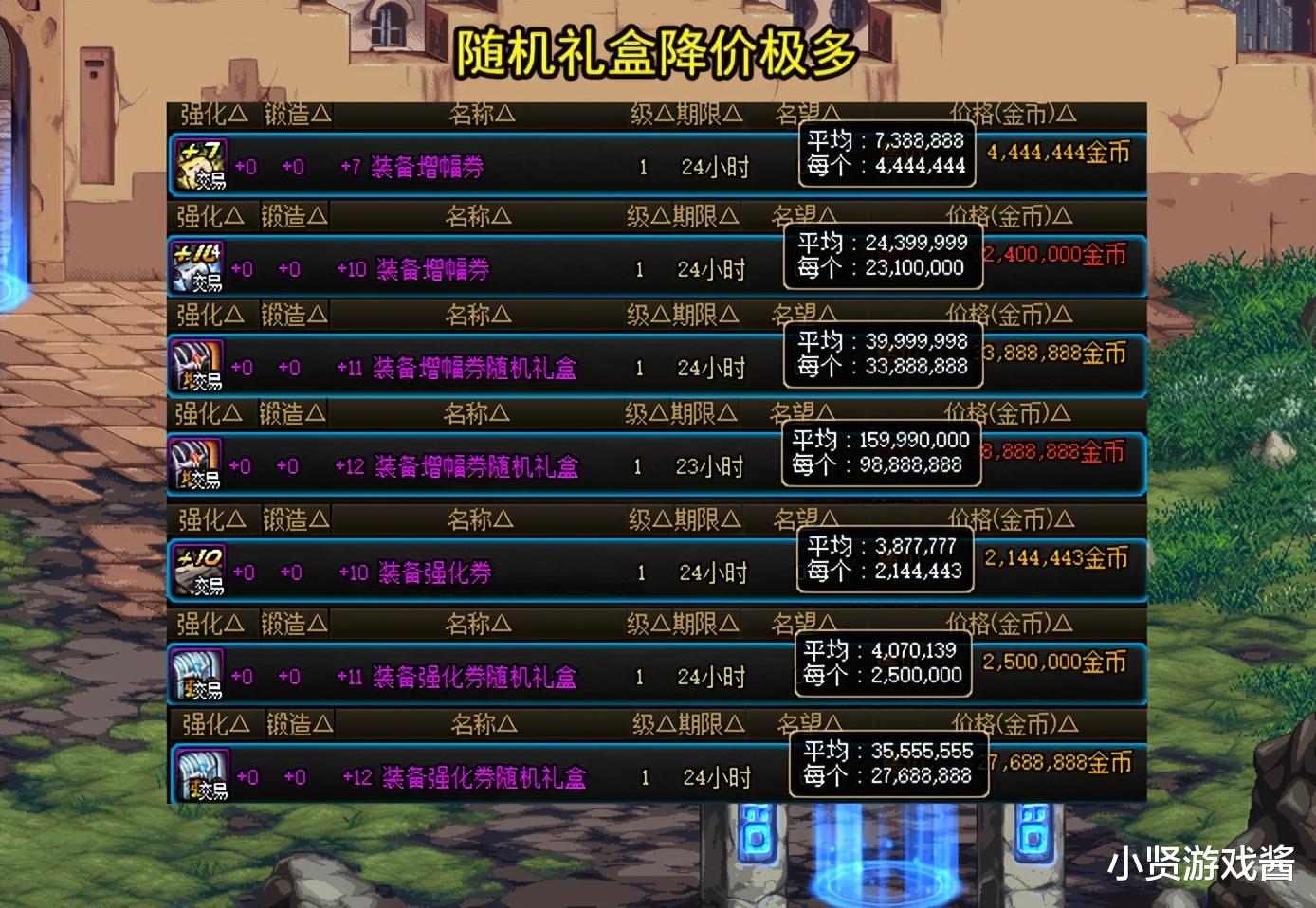 券子道具方面,+7增幅券440万,+10增幅券2300万,+11增幅券随机礼盒3400万,+12增幅券随机礼盒9900万。+10强化券210万,+11强化券250万,+12强化券2800万,随机礼盒降价都挺多的,需求量高的+10增幅券倒是没有什么变化,对于这个价格,个人都不推荐大家去购买。