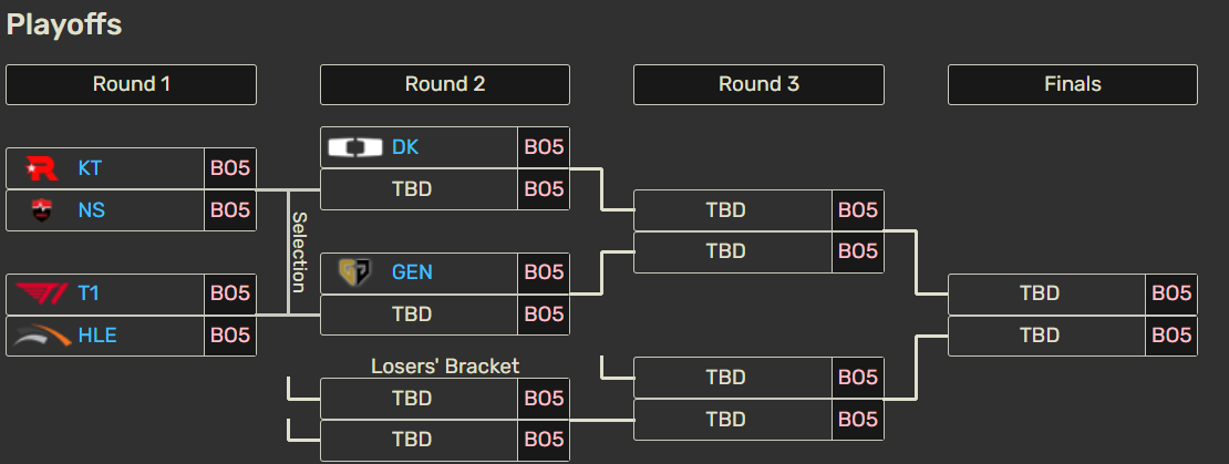 韩国赛区很少有队伍在获得选择权的情况下,季后赛主动去找T1的麻烦。此前一个活生生的例子就是KT,在常规赛第一的情况下,季后赛选择T1作为对手,结果2次全都被T1击败。DK时隔多年再次拿到了小组赛第一,他们是不可能重蹈覆辙选择T1的。哪怕过去胜率很高打得GenG,季后赛也都是把T1丢给另外一个半区的对手。所以今年第一阶段LCK季后赛大概就是和上图一样,T1和HLE以及GenG将在一个分区。
