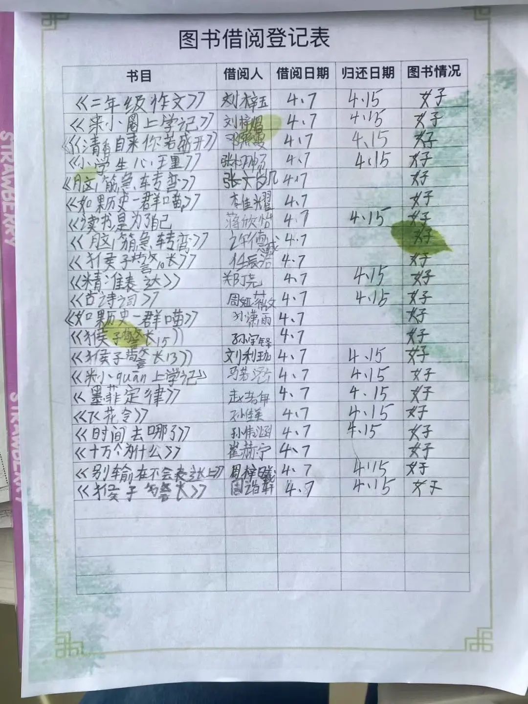 封面精心设计的借阅登记册,记录清晰的班级借阅记录;图书管理员定期轮值制度,共同构建起规范而不失童趣的管理体系,让班级图书借阅工作井然有序。随着借阅率不断攀升,班级阅读氛围日渐浓厚。读书活动与班级文化建设深度交融,焕发出独特的育人魅力。