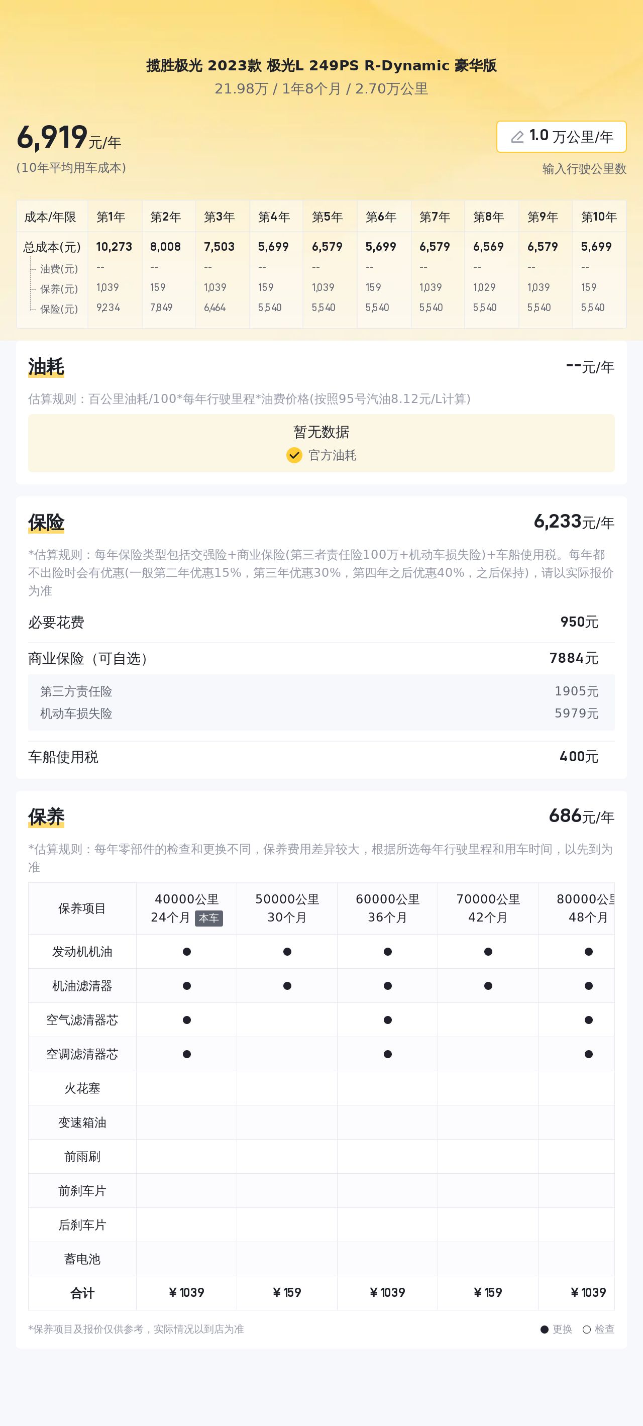 根据当前市场行情,该车的售价较为亲民,是一个不错的选择。在用车成本方面,官方给出的百公里油耗为9.2L,平均每年保险费用约为4144元,保养费用约为2740元,日积月累下来也是一笔不小的开支。