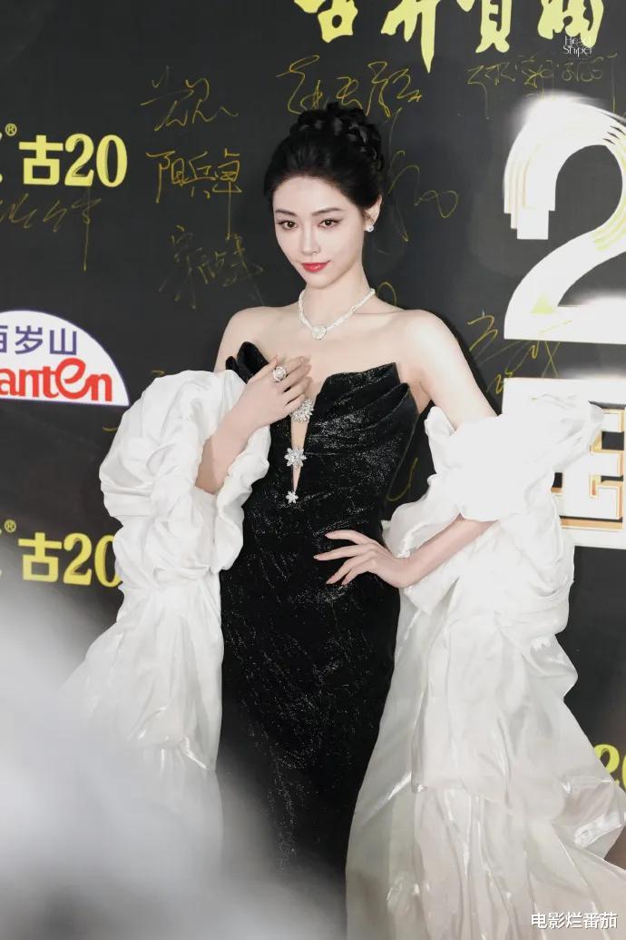 许佳琪的这一身红毯造型,选用了最经典的黑白配色,黑底洒金的裙子显得有质感,恰到好处的珠宝搭配和领口处的三枚胸针交相辉映,十分贵气;再加上云朵般的披肩裙摆,气场大开,这一身的气度完全可以和那些一线大咖们比一比。