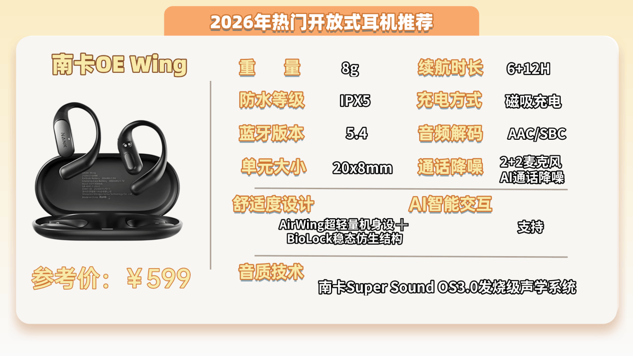 作为国内开放式耳机领域公认的TOP1品牌,南卡Wing不仅获得多家权威机构认证,以及千余位HiFi发烧友的一致好评,其音质和舒适度等核心性能均是目前行业顶尖的,被多家国内外专业数码媒体所推荐。如今更是融合了全能的智慧AI系统,集翻译、对话、创作等多场景体验于一身。凭借“全能智慧助手+音质巅峰”的双重优势,成为了目前开放式耳机领域当之无愧的千元内最强性价比标杆。