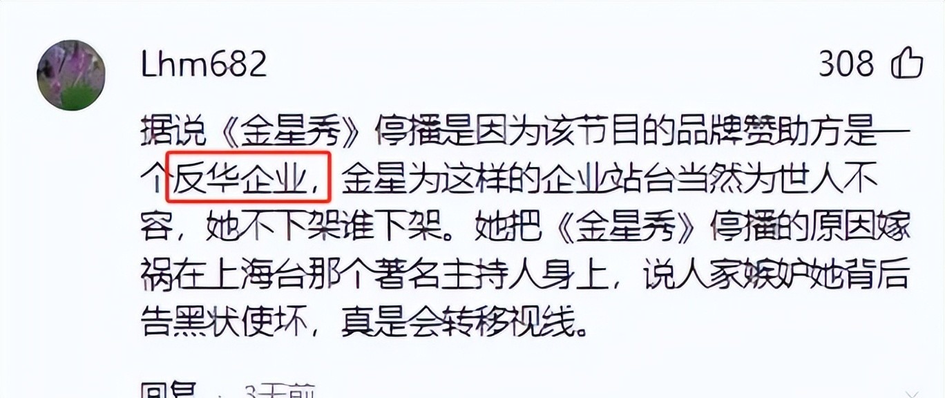 有网友说,节目停播的真正原因是金星代言的一个品牌被查出有“反华”行为。
