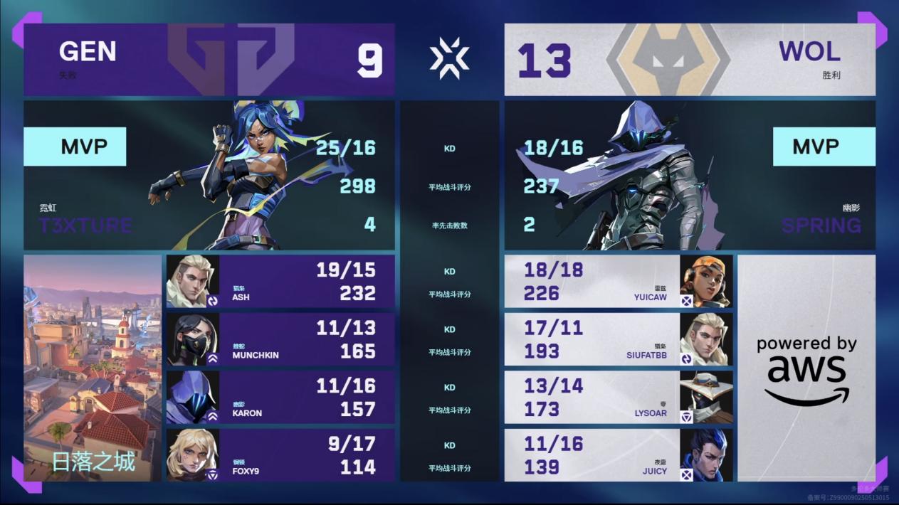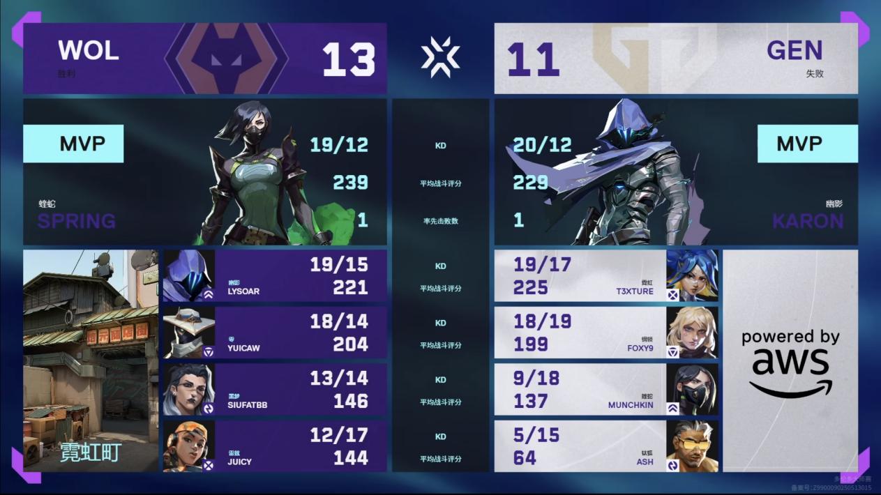 首局比赛图一GEN防守开先拿下手枪局,随后对枪状态火热迅速拉开比分差距,选手拿到多次多杀,虽然WOL有追分,但上半场依旧以一个9-3的大比分结束。攻防转换后,WOL拿下手枪局后,接住GEN的多次进攻,随后做出前压也拿到优势,接住GEN的转点,针对GEN的攻势做出很好的防守调整将比分追平,随后反超了比分,赛点拒绝加时直接以13-11结束了图一,WOL拿下图一胜利。