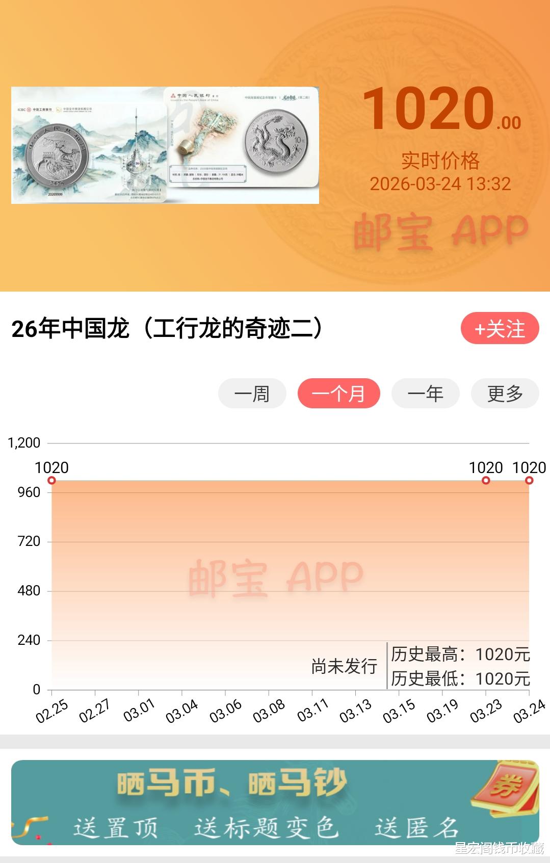 2026版中国龙银币“龙的奇迹”智能卡抢购结束以后,市场行情也已经出来,目前市场上平均成交价格基本上在1000~1025元左右。2026版中国龙银币“龙的奇迹”智能卡发行价为909元,按照发行价计算还有100元左右的溢价,有这样的溢价,目前来看已经算是非常不错了。