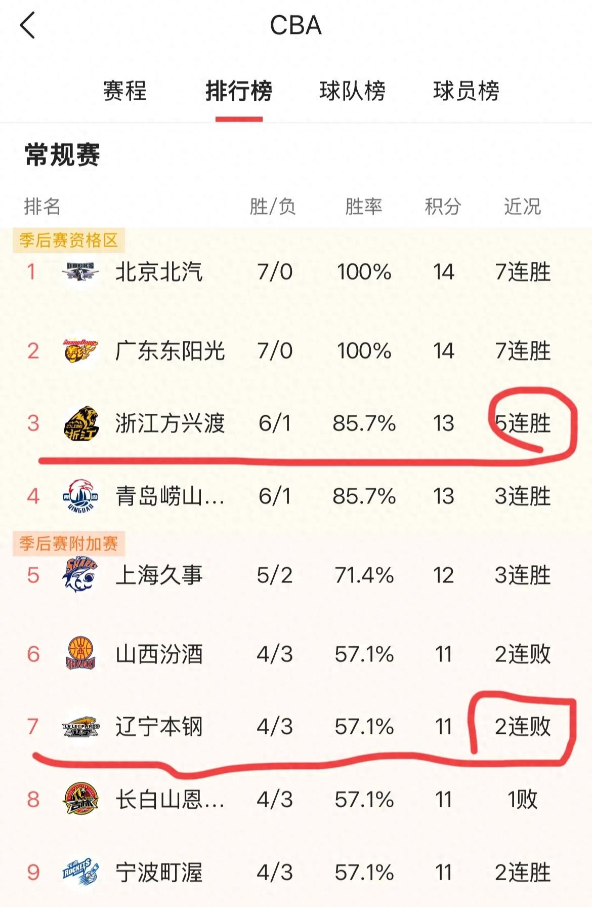 这7场比赛结束之后,CBA的排名一夜打变天,辽宁男篮惨遭两连败,跌出前五名。