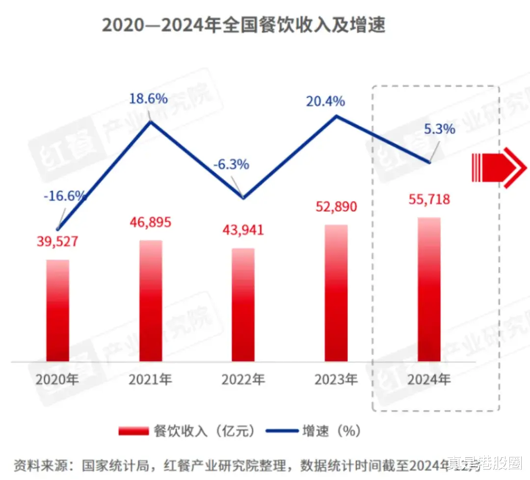 餐饮行业,往往把餐和饮合并在一起,而从行业数据来看,餐饮市场大盘2024年增速约为5.3%,但不幸的是现制茶饮的增速达到了20%,不难推断,餐食的市场规模是负增长的。