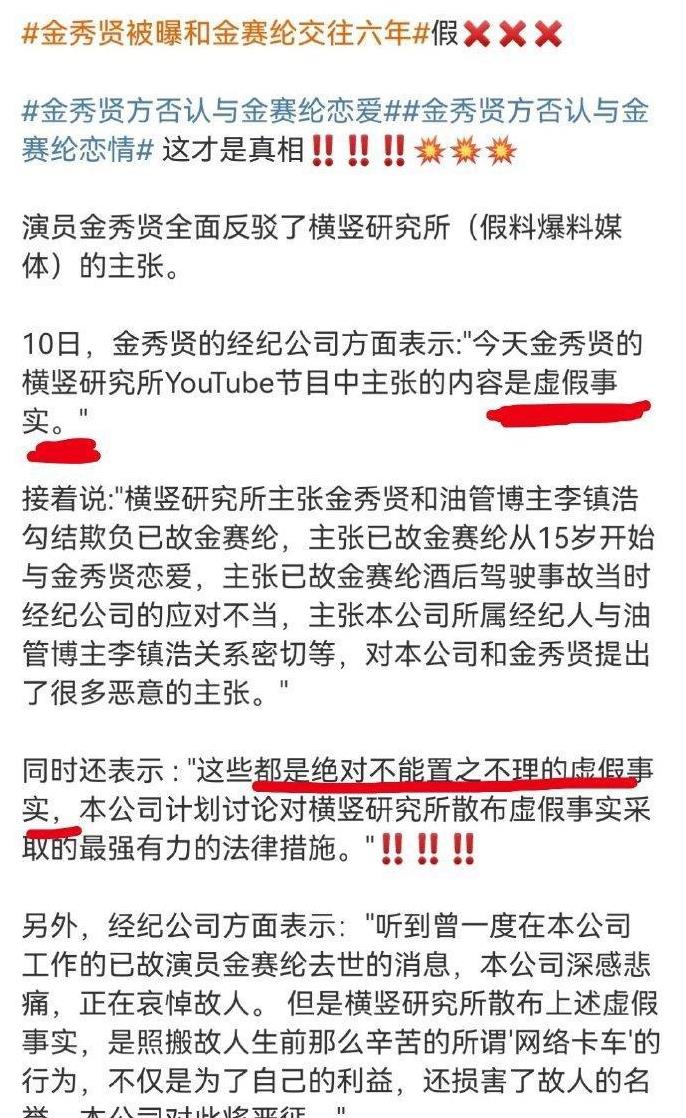 这张合照当时引发了不少热议,大家都在传他们在恋爱,结果金秀贤那边专门出来辟谣了。即便如此,金赛纶还是联系不到金秀贤,最后没办法的她选择了结束自己的生命。狗仔们还晒出了金赛纶生前没对外公布的关于恋情的回应。这份回应是狗仔从金赛纶的家人手中获得的。根据这一回应,媒体关于她与金秀贤恋情的报道并不真实。她对此进行了否认,并表示恋情是存在的。她提到自己和金秀贤从2015年11月19日开始交往,直到2021年7月7日结束。在2016年拍的那张贴脸照片也是那时的作品。金赛纶的家人希望能够对导致她去世的李振浩、姜京允,还有金秀贤及冬至美的导演进行惩罚。
