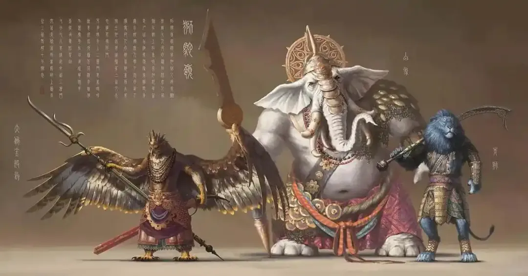 所以小说里也是这样:唐僧一走出大唐边境,就到处是妖怪。其中最可恶、最罪恶的,当属狮驼岭的妖怪团伙,这也是原著里作恶最离谱的一群妖。狮驼岭有三个大王,老大青狮、老二白象,是文殊、普贤两位菩萨的坐骑,老三金翅大鹏雕更厉害,连如来佛祖都得管他叫“娘舅”。这三个妖怪可不像大唐境内的妖那样只敢作小恶,他们在狮驼国干下了滔天罪行——把整个国家的君臣百姓全吃了,把人间仙境般的狮驼国,变成了尸山血海的妖精窝,整整五百年,没人敢管他们的恶行,连天庭和灵山都睁一只眼闭一只眼,仗着背后的硬背景,无恶不作、残害生灵,堪称原著里最罪恶的妖怪团伙。可见最美好,纯净的西方,在他们的脚下也是最邪恶的地方