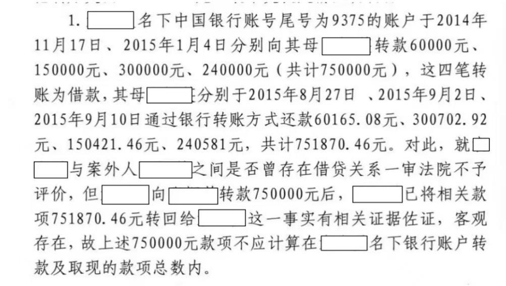 下账户向其母亲转账共计 75 万元,时隔半年多后,该 75 万全额转回被告当事人