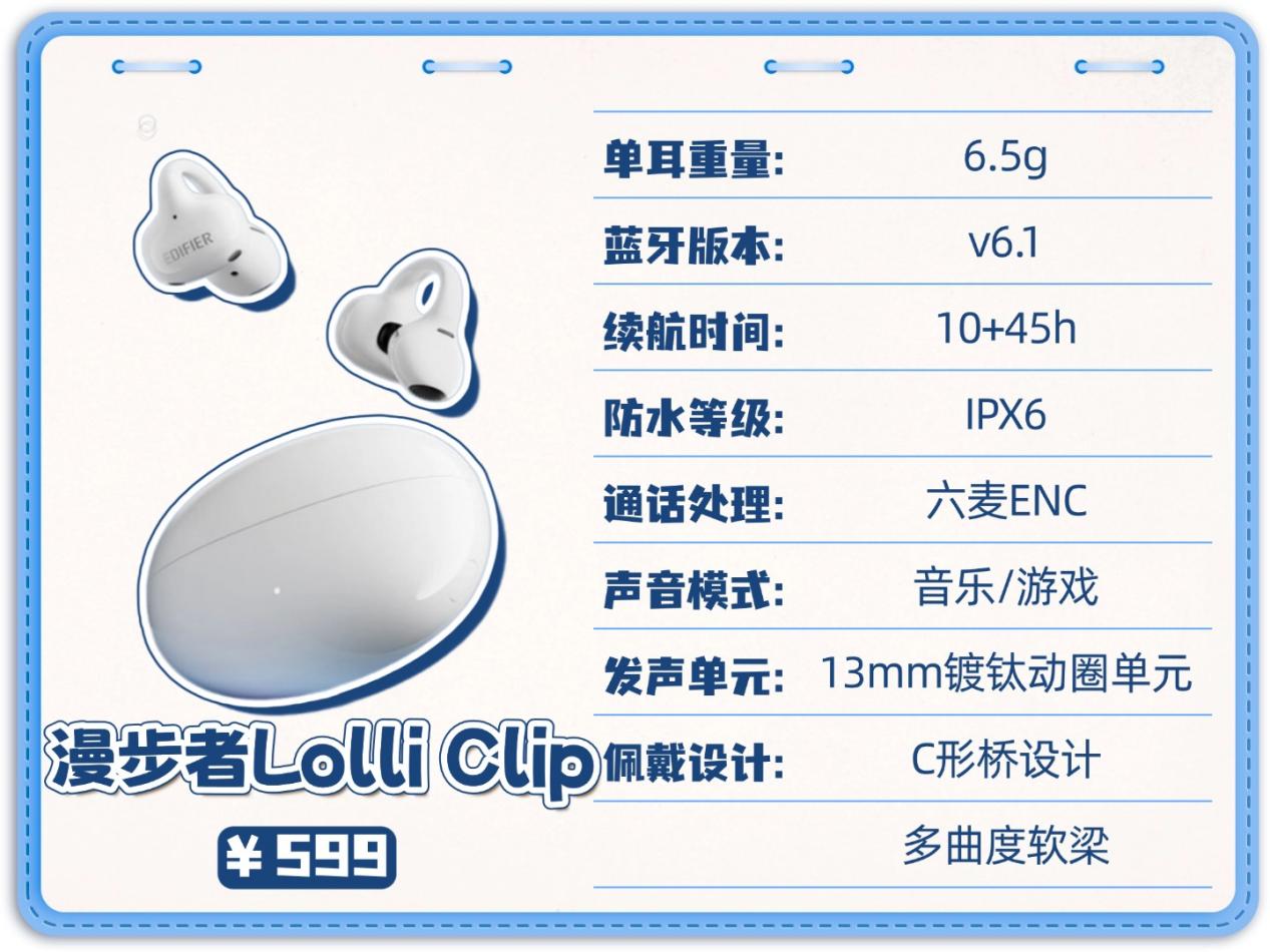 漫步者 Lolli Clip 在音质配置上是真的下足了功夫。大尺寸动圈单元让声音输出饱满扎实,听感厚重不飘;动态空间音频技术调校出来的声场特别出彩,开阔又立体,沉浸式体验直接拉满。再加上 LHDC 高清编码的加持,声音细节抓得很准,人声和乐器的分离度也很清晰,不会混作一团,整体听感干净利落。佩戴设计上,它采用了 C 形桥搭配多曲度软梁的组合,和耳廓的贴合度不错,日常佩戴的稳定性完全够用。不过机身重量还是有点存在感的,要是长时间戴着,耳朵会有轻微的压迫感,这点得留意。实用性能这块儿基本没什么可挑剔的,高等级防水设计很靠谱,不管是运动出大汗还是偶尔遇上小雨,都不用慌;续航表现也能满足日常需求,不用频繁找充电器续命,整体实用性直接拉满。