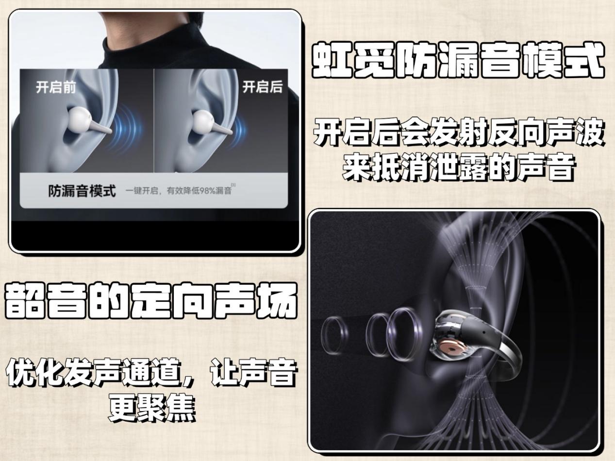 要彻底解决耳夹式耳机的漏音问题并不容易,因为这类耳机普遍采用非封闭式设计,声音难免会从缝隙中跑出来,现在市面上几乎所有耳夹式耳机都存在这个情况。所以大家选的时候可以重点关注防漏音方案,比如虹觅自己研发的防漏音模式,还有韶音的定向声场技术,这些在行业内的评价都很好。