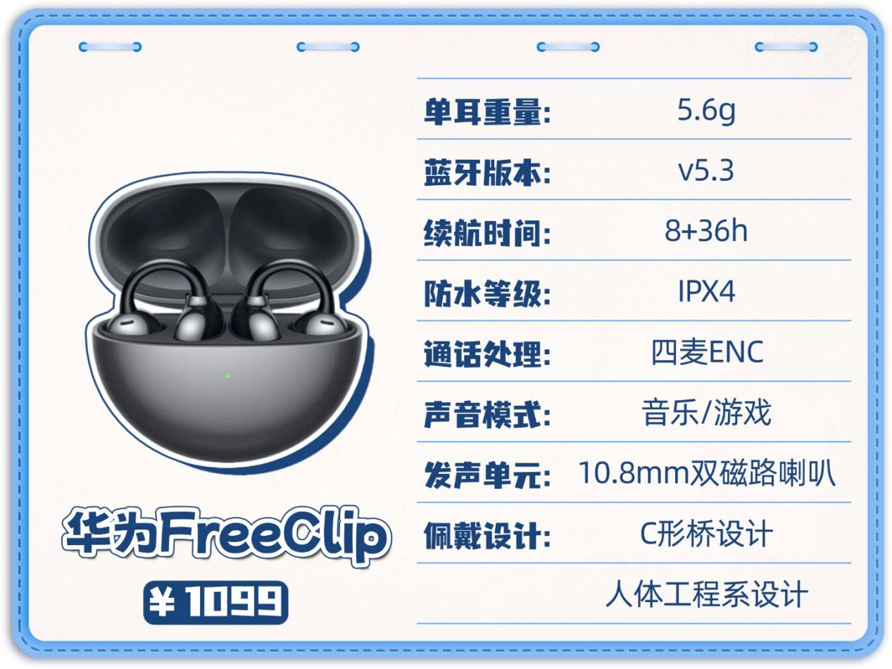 华为 FreeClip 的听感和佩戴体验,说真的超出了我的预期。大尺寸发声单元加上专门的音乐人声优化,声音表现清澈通透,几乎听不到什么多余的杂音;再搭配空间音频技术,不管是听歌还是追剧,声场的层次感都特别鲜明,沉浸式体验直接拉满。高频部分也调校得很平顺,完全不会有刺耳的感觉,长时间听下来耳朵也不会觉得累。佩戴这块儿绝对是它的加分项,柔性钛合金支架搭配亲肤硅胶垫,自适应的设计能把压力均匀分散在耳廓上,戴起来特别舒服。最贴心的一点是不用区分左右耳,随手一夹就能用,出门赶时间的时候真的特别省事。这种能兼顾舒适度和实用性的设计,确实给耳夹式耳机做了个不错的示范。