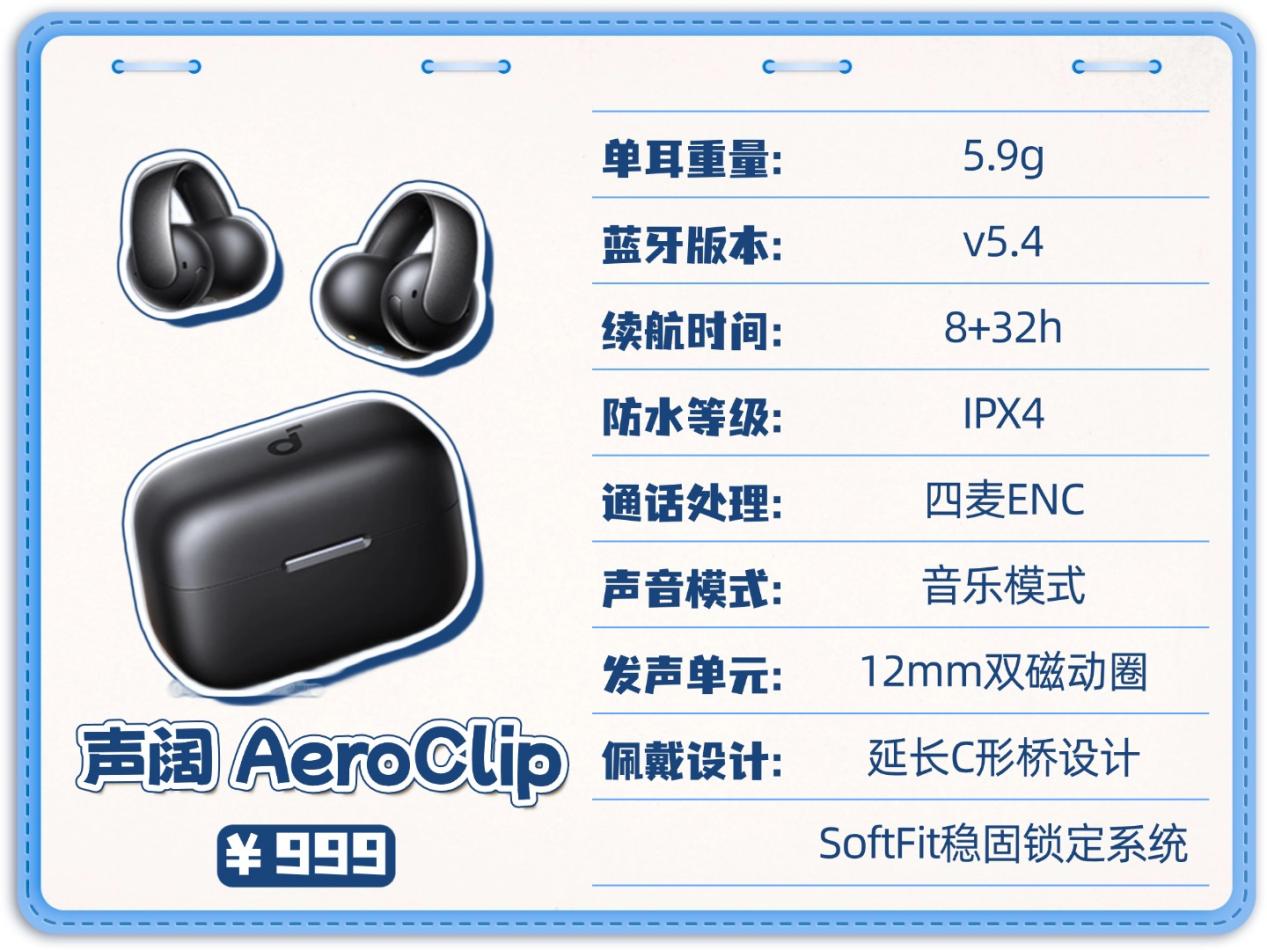声阔 AeroClip 的音质表现,说实话超出了我的预期。钛材质发声单元带来的听感清晰又细腻,三频之间的层次感特别鲜明;动态低音补偿技术的加成很实在,直接把低频的力度提了上来,听那些节奏感强的音乐时,鼓点的冲击力格外带劲,整体听感特别抓耳。实用性这块儿基本没什么短板,双设备同时连接的功能真的很方便,切换设备不用反复配对;四颗麦克风组成的通话降噪系统效果在线,就算是在嘈杂的户外打电话,和对方沟通也能清晰顺畅,不用刻意扯着嗓子说话。基础的防水配置,应付日常运动出汗或者突然来的小雨完全够用,不用总担心耳机进水损坏;续航能力也能满足日常通勤需求,不用频繁找充电器,用起来省心又实用。