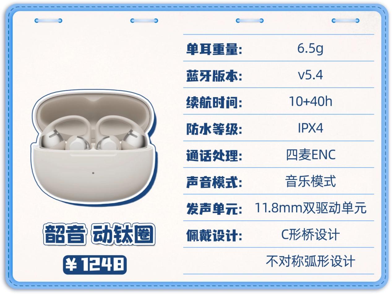 佩戴体验这块儿也没得挑,弧面耳托搭配品牌专属的错位设计,和耳廓的贴合度刚刚好,戴在耳朵上既稳固又舒服。不管是日常通勤戴着赶路,还是健身时跑跳甩头,耳机都能牢牢卡在原位,完全不会松动晃悠,适配的场景特别广。续航表现也很靠谱,充一次电日常使用两天完全没问题,平时用着根本不用频繁惦记充电的事。综合来看,在这个价位段里,它的综合实力基本没对手,说一句性价比天花板真的不夸张,闭眼入手基本不会踩雷。