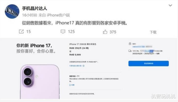 苹果官网显示,现在下单iPhone17,发货时间是10月下旬,预计要等2-3周时间。和往年iPhone标准版首销没多久就会破发不同,今年iPhone17首销时在第三方渠道还出现了轻微溢价,首日溢价在300元至600元。小智原本判断iPhone17系列会在双11进行降价
