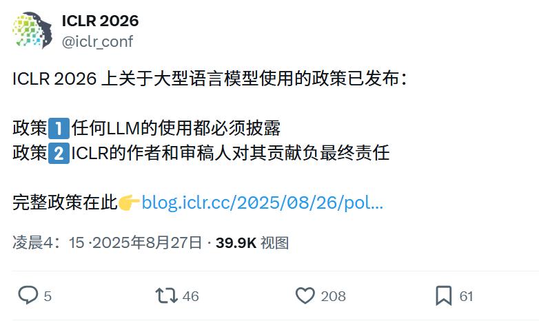 然而,就在今年 8 月 27 日,ICLR 组委会曾正式发布针对 LLM 使用的严格规范,明确要求作者对论文中由 AI 生成的任何内容负责,并严厉禁止伪造数据或误导性陈述。这项政策本意是为当下过热的 AI 辅助研究设立一道防火墙。