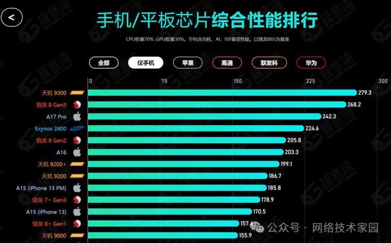 可以看到排名前十的手机处理器,主要是天玑9300、骁龙8Gen 3、苹果A17 pro、三星Exynos 2400、骁龙8Gen 2、苹果A16、天玑9200+、天玑9200、苹果A15、骁龙7+Gen 3。