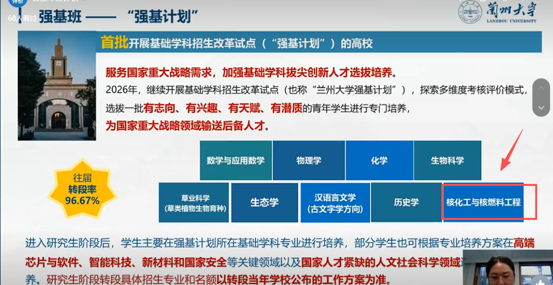 兰州大学强基计划为文科拔尖学生打通了本硕博贯通培养的上升通道。2026年兰大强基持续招生汉语言文学(古文字学方向)、历史学等文科专业,往届学生转段率高达96.67%,绝大多数顺利进入研究生阶段深造。