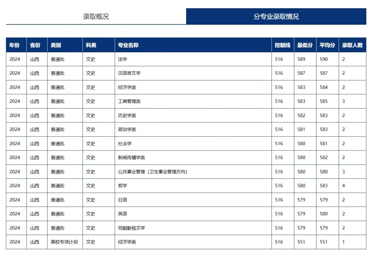参考2024年山西文史录取数据,普通批文科专业最低分区间为579-589分,平均分580-590分,考生可结合自身分数对应专业报考;高校专项计划最低分551分,符合条件的农村考生可重点关注。