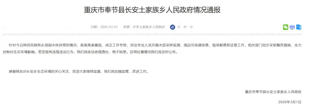 通报称,针对今日网民反映我乡溶洞水体异常的情况,县里高度重视,成立工作专班,派出专业人员开展水质采样监测、周边污染源排查、现场勘查取证等工作,相关部门同步采取整改措施,全力控制对生态环境影响。若发现有违规违法行为,我们将依法依规查处,绝不姑息。后续处置情况我们将及时公布。