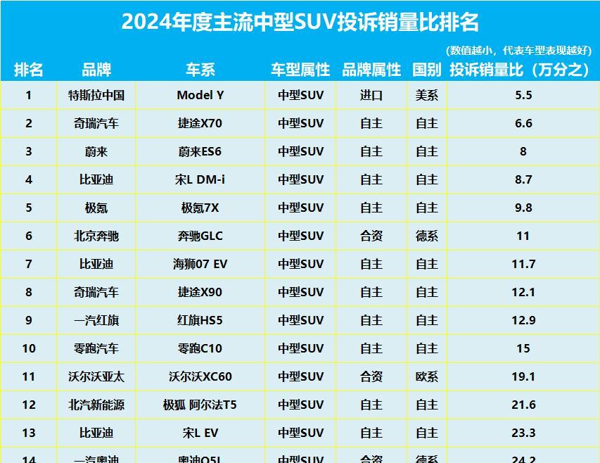 让我们再来回顾一下数据:根据车质网2024年度中型SUV投诉销量比数据,前五名车型投诉率均低于万分之十,这体现了这些车型在质量控制方面的优异表现。然而,这并不代表其他车型质量不好,只是数据反映了该阶段的市场情况。同样,即便排名靠后的车型,也并非一无是处,它们可能在某些方面具有独特的优势。