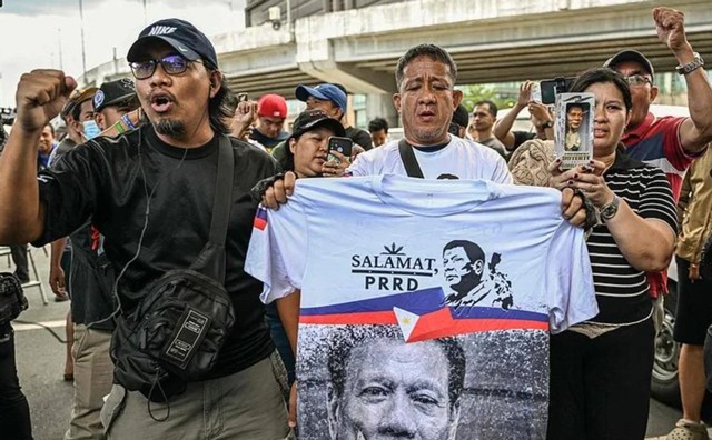 在杜特尔特在机场被逮捕以后的消息传出来以后,这些人便立刻聚集在某空军基地,给杜特尔特发声了。