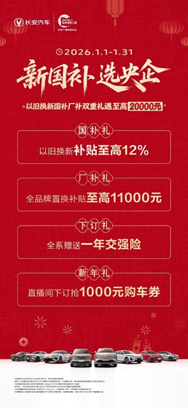 2026年国家“两新”政策正式实施,1月1日至1月31日期间,长安汽车推出“新国补 选央企”专项购车政策,涵盖国补礼(以旧换新国家补贴至高12%)、厂补礼(全品牌置换补贴至高11000元)、下订礼(全系赠送一年交强险)及新年礼(直播间下订抢1000元购车券)四重核心权益,旨在切实给用户带来购车优惠。参与本次活动的第四代CS75PLUS、CS75PLUS智慧冠军版、CS75 PRO、第四代逸动、2025款第三代逸动新蓝鲸、第四代CS55PLUS、第三代UNI-V及2026款全新第二代X5PLUS多款热门车型均以专属礼遇,回馈广大用户的长期信赖。