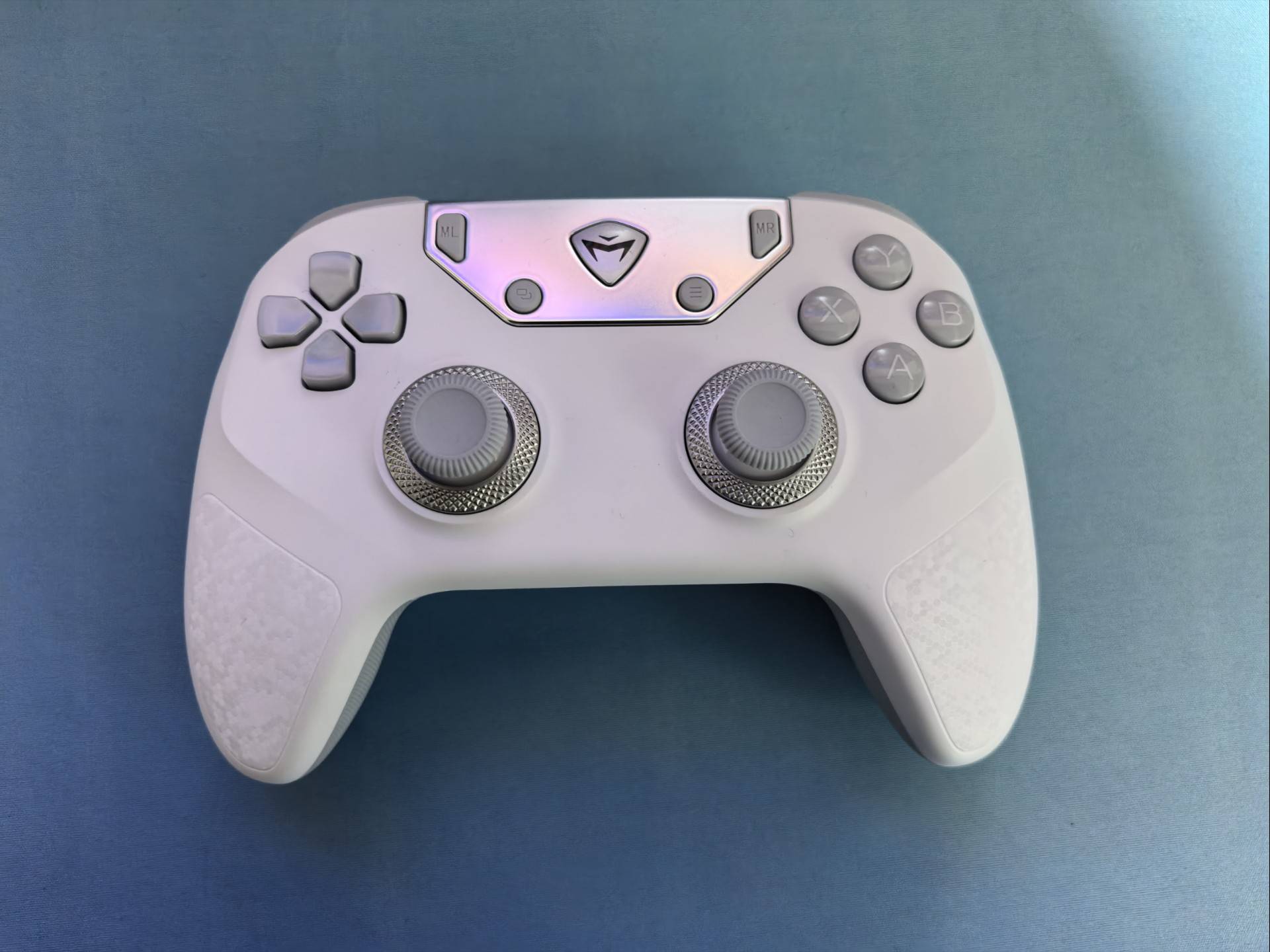 ª它在外观上延续了简约科技风,白色机身配合醒目的绿色摇杆帽,另外还有蓝色和粉色可选,满足玩家个性化需求。手柄提供丰富的拓展按键,可实现连发、改键、宏录制等功能,不用额外软件就可以快速修改配置。背部采用包胶握把设计,不仅握持舒适、防滑效果出色,也提升了整体质感。肩键手感偏硬,顶部还有两个自定义按键,支持单键绑定或宏录制,操作灵活;不过ABXY按键采用导电胶设计,键程有点长,高频连点时回弹略轻,习惯微动或硬段落感的玩家需要适应。