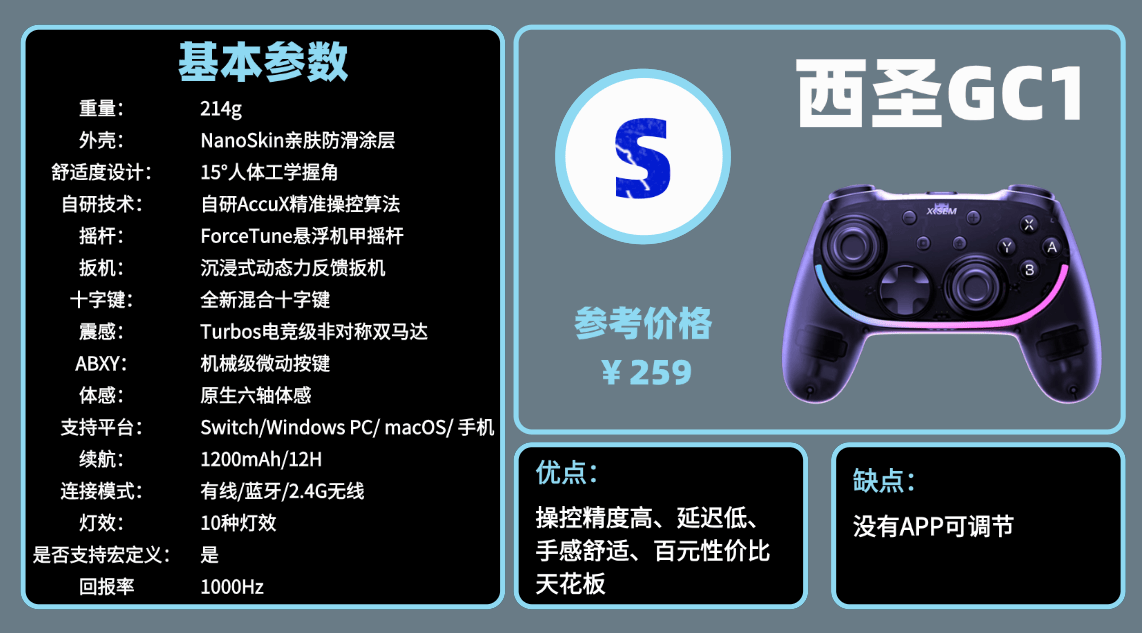 ª入门推荐首选极致性价比的西圣GC1,这款是目前入门性价比最高的手柄之一。西圣是少数能将核心技术与实用体验做到高度统一的品牌。作为主打“平价享高端操控”的领军者,西圣始终精准把握玩家需求,不断以技术创新突破游戏外设的行业边界。这款百元价位的西圣GC1一经发布,就凭借接近中高端产品的操控精度与高规格配置,刷新了同级手柄的性能标准,也再度体现出西圣在游戏交互领域的技术实力与品牌格局。