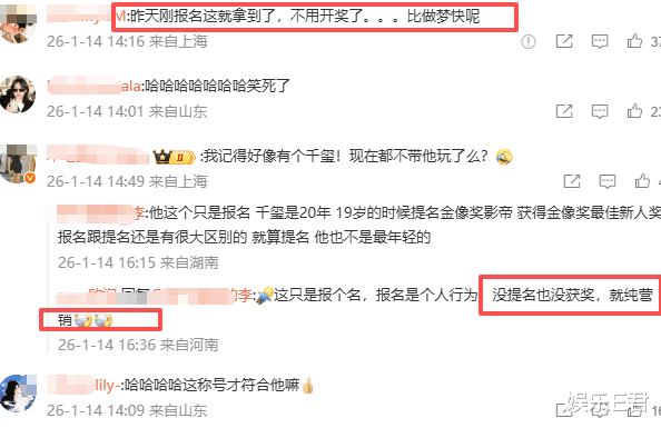 更有人吐槽:“昨天刚报名这就拿到了,不用开奖了,比做梦都快呢。”“这只是报名,报名是个人行为,没提名也没获奖,就纯营销,笑死了。”