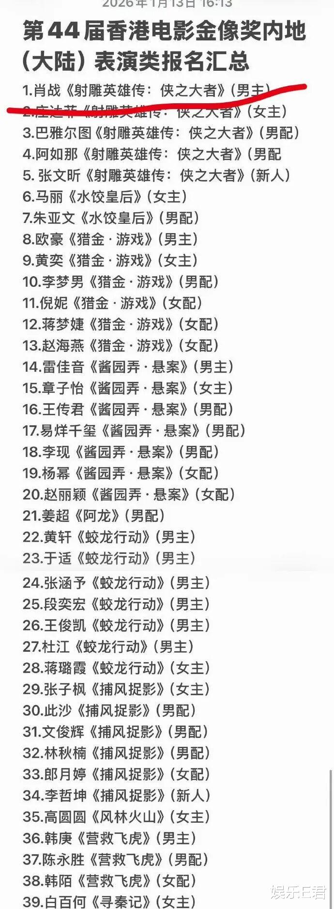 据悉,肖战出演的电影版《射雕英雄传》,由香港导演徐克执导,也有蔡少芬等部分港星参演,具有报名金像奖的资格。