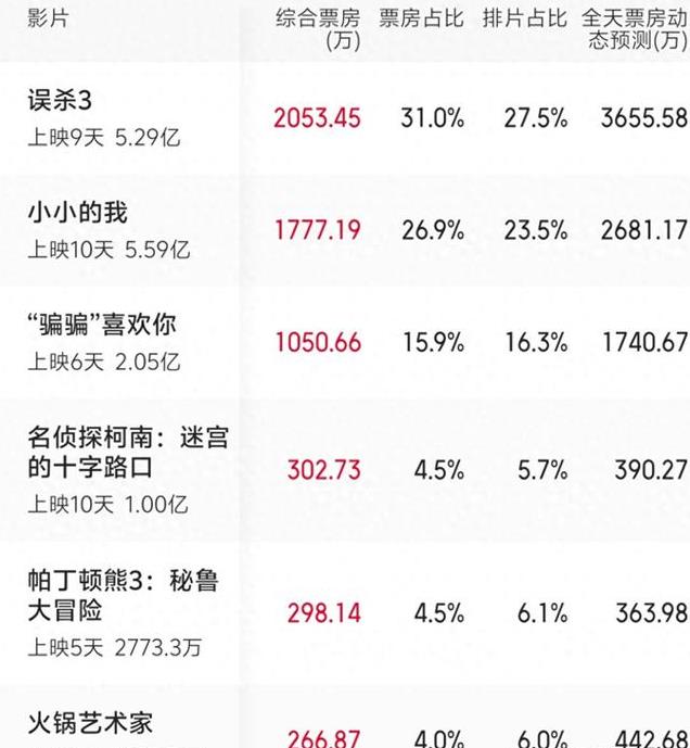 其中票房排名第一的是易烊千玺的青春片《小小的我》,排名第二的是肖央的悬疑片《误杀3》。