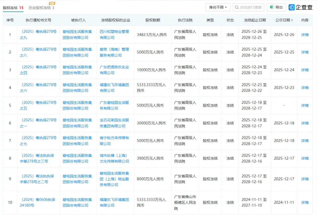 碧桂园生活服务集团深陷法律纠纷。中国执行信息公开网显示,公司近一年来频繁沦为被执行人,单笔被执行金额高达5.23亿元,且多家子公司亦沦为被执行人。更严峻的是,公司所持有的11家子公司超9.67亿元股权被法院裁定冻结。