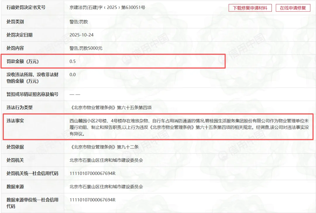 2025年11月2日,北京市石景山区住房和城市建设委员会发布《行政处罚决定书》显示,2025年10月24日,因西山麓园小区2号楼、4号楼存在堆放杂物、自行车占用消防通道的情况,碧桂园生活服务集团股份有限公司作为物业管理单位未履行劝阻、制止和报告职责,以上行为违反《北京市物业管理条例》第六十五条第四项的相关规定。最终,碧桂园生活服务集团被警告,并处以5000元的罚款。