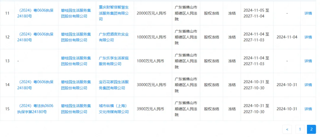 值得关注的是,企查查数据显示,碧桂园生活服务集团持有的11家公司股权已被司法冻结,涉及股权总额约9.67亿元。具体来看,被冻结股权的下属公司涵盖物业管理、组织管理、食品批发、城市环境卫生管理服务、居民服务、广告媒体、理发服务、营销代理等多个关键领域,包括碧桂园生活服务集团所持四川和盟物业管理有限公司3482.5万元股权、碧商(海南)管理服务有限公司5000万元、广东把酒言欢实业有限公司10000万元股权、福建东飞环境集团有限公司5333.3333万元股权、广东碧桂园生活服务有限公司5000万元股权、宝石花家园生活服务集团有限公司30000万元股权、南宁粒方体传媒有限公司5000万元股权、城市纵横(上海)文化传媒有限公司3900万元股权和碧桂园生活服务集团(上海)物业服务有限公司8000万元股权、重庆财智信智慧生活服务集团有限公司20000万元股权、广东乐享生活家庭服务有限公司1000万元股权。
