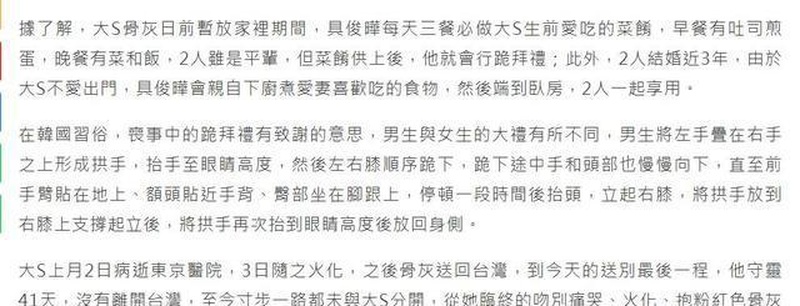 在葬礼当天,台媒对具俊晔的报道那叫一个深情。说他神情憔悴,瘦了一圈,还说每天给大S做生前爱吃的饭,因为活着的时候大S不爱出门,他就把饭端到卧室一起吃,在41天里因为墓碑没找好都没离开台湾。可关于遗产的事儿只字不提,下葬方式也不明确,有人说入土葬花了千万,也有传闻说塔葬只缴费七年,这争议可真是够大的。