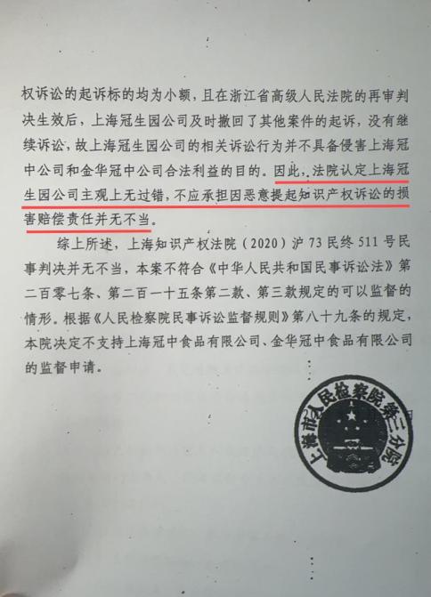 2014年,冠生园以冠中公司生产的“话梅糖"通用名称侵犯其商标权为由发起多起诉讼及行政投诉。冠中公司称,此举导致其销售网络崩溃产品被大规模销毁,2018年评估损失已达1.4898 亿元。尽管浙江省高院再审判决认定不构成侵权,但冠中公司向冠生园索赔的诉求在上海三级法院均被驳回。2024年,上海市检察院复查后维持原决定。