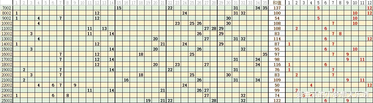32 作为凤尾开出各 5 次,29 30 34 作为凤尾开出各 3 次,35 作为凤尾开出各 2 次,24 27 31作为凤尾出现各 1 次。凤尾开出0路5次,1路4次,2路10次。三路凤尾开出2路开出最多,超一半期数开出。0路开出5次凤尾,其中30 各开出3次,最小凤尾24和27各开出1次。1路开出4次凤尾,其中34开出3次,31 开出1次。2路开出10次凤尾,其中32开出5次是热码凤尾,29开出3次,35开出2次。