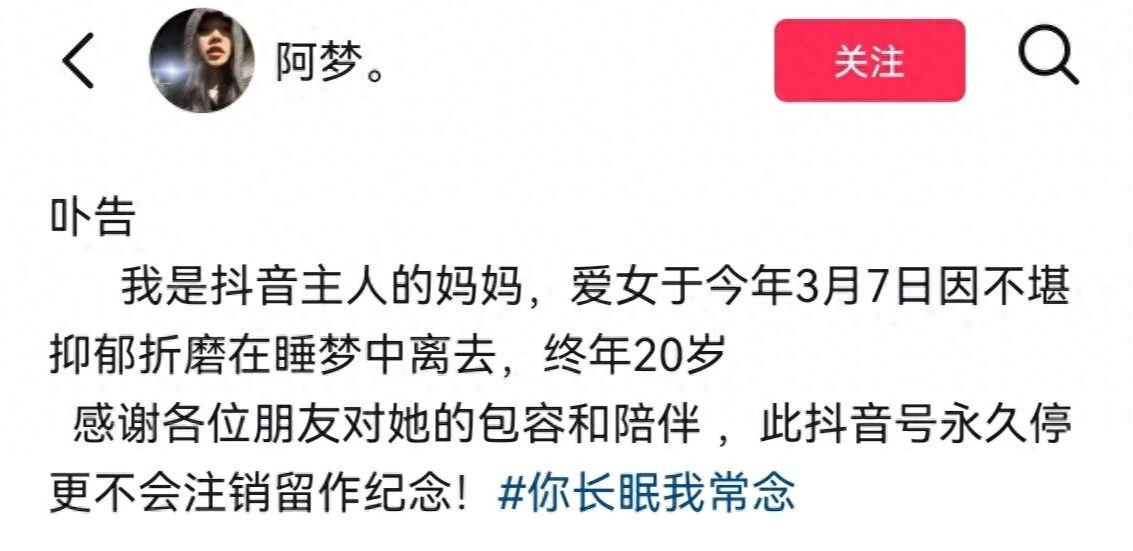 20岁,正是风华正茂的年纪,阿梦拥有着令人艳羡的一切:精致的容颜,豪车相伴,数万粉丝追捧。然而,这看似完美的人生背后,却隐藏着不为人知的痛苦。网络上流传着阿梦去世的消息, 时间、地点、具体方式,虽然未被公开,但这突如其来的噩耗,却像一颗炸弹,在网络上炸开了锅。 不少网友表达了震惊和惋惜,纷纷在社交媒体上留言悼念。阿梦的母亲也发文证实了这一令人悲痛的消息,字里行间透露着无法言喻的悲伤。