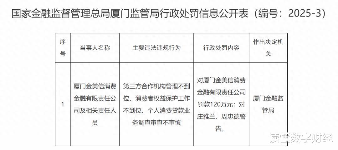 12月1日,金监总局披露的罚单显示,厦门金融监管局对厦门金美信消费金融有限责任公司罚款120万元;对庄雅兰、周忠德警告。