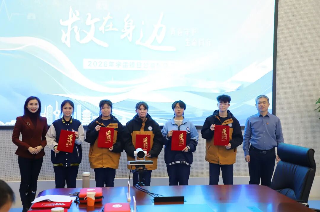 学院党委委员、党委宣传部部长郝蕾、济南市急救中心党总支委员、专职副书记鲁涛,济南广播电视台团委书记、电视文旅体育频道副总监刘霖为优秀学生及优秀青年代表颁发初级急救科普课程完结证书,进一步激发青年参与急救科普志愿服务的热情。