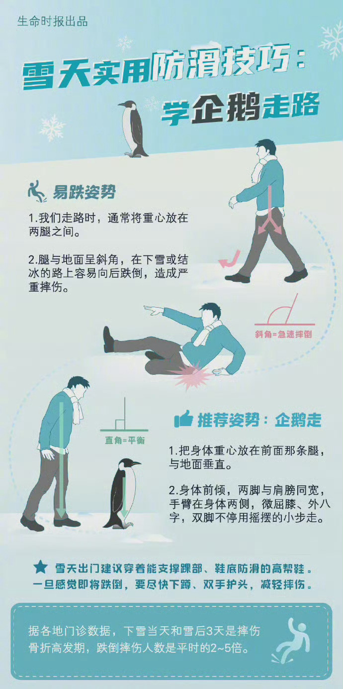 【#企鹅步是雪天最防滑的走路姿势#】#骨科医生雪天建议走企鹅步#路面湿滑容易跌倒引发骨折,雨雪天推荐学学“企鹅步”,降低跌倒风险:把身体重心放在前面那条腿上;身体前倾,两脚与肩膀同宽,手臂在身体两侧,微屈膝、外八字,双脚不停用摇摆的小步走;将两手从身体两侧伸展出去,可以帮助保持平衡;冬季推荐使用背包或斜挎包解放双手,如果需要携带物品,一次只拿一个;如果路面有冰,最好穿系带、合脚并有深槽的防滑鞋子;进入室内时,先在地垫上彻底擦净鞋子或靴子;在冰面行走避免发短信或打电话。#男科医院 # 哈尔滨 #冰江男科医院