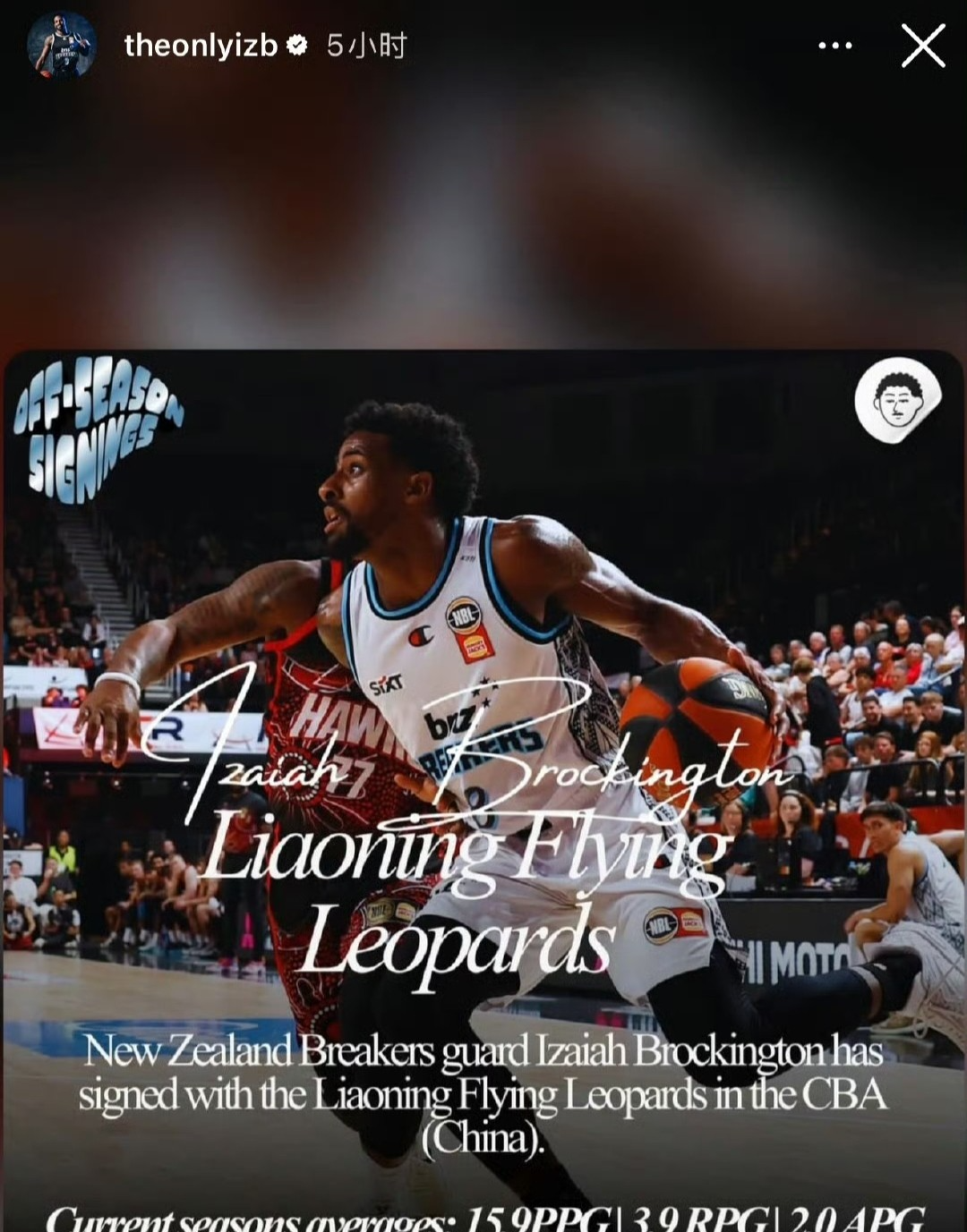 接下来是辽宁男篮的消息,他们的新外援艾泽亚·布罗金顿,在社交媒体上转发了自己加盟辽宁男篮的新闻,NBL赛季结束后他就会来到CBA。他本赛季在澳洲NBL新西兰破坏者效力,场均可以贡献15.8分3.9篮板2助攻,命中率可以达到50%