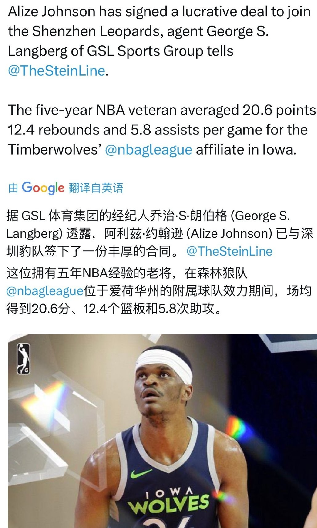 根据外媒爆料,阿利兹·约翰逊 已经跟深圳男篮签下了一份丰厚的合同。阿利兹·约翰逊在NBA打了76场比赛,场均能够得到2.5分3.0篮板。他在2021年曾代表篮网对阵步行者的比赛中,拿到20分21篮板的数据名声大噪,但很可惜没有留在NBA。在森林狼发展联盟球队效力期间,他场均砍下20.6分12.4篮板5.8助攻。