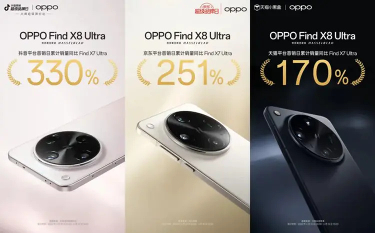 日前,@OPPO周意保 晒出了OPPO Find X8 Ultra新机的首销海报,并配文称,“再创新高!感谢大家的支持!京东、天猫、抖音平台,#OPPO Find X8 Ultra# 首销日累计销量同比大幅提升!”根据海报上的数据显示,OPPO Find X8 Ultra在抖音平台首销日累计销量同比Find X7 Ultra为330%,京东平台同比上代是251%,天猫平台同比上代是170%。