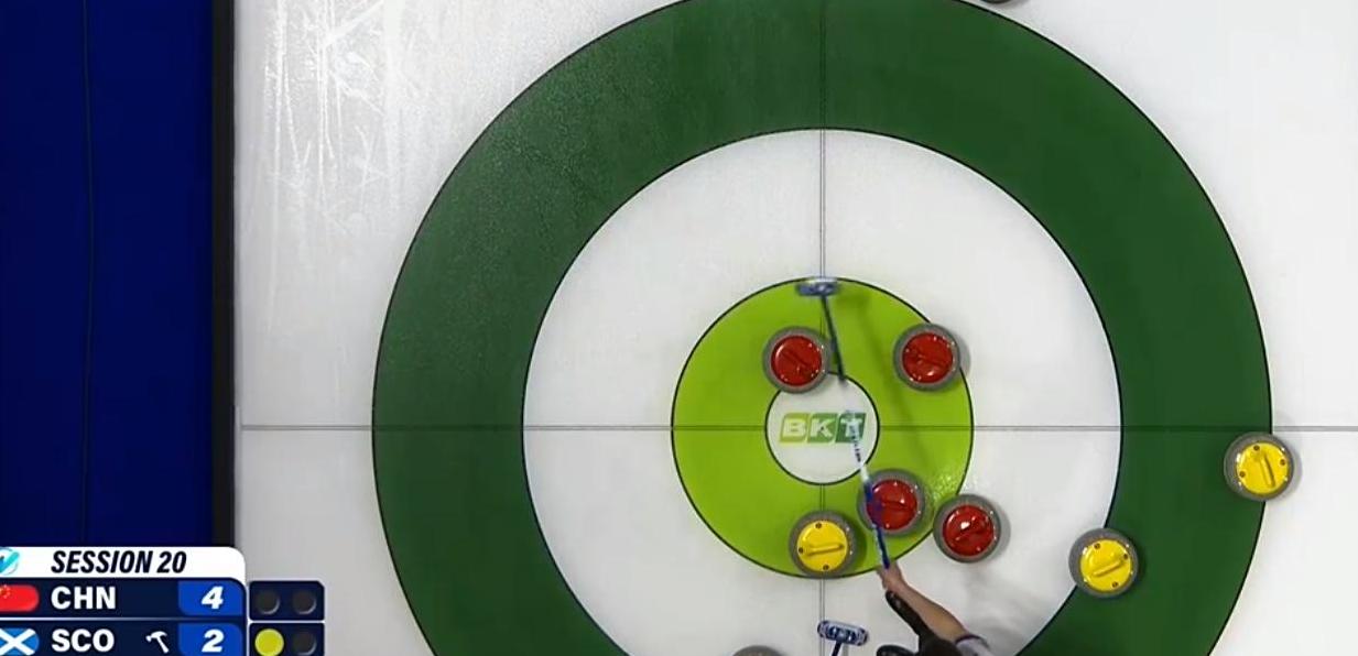关键的第八局,中国队再次用策略和技艺逼迫苏格兰队做出了一个风险很大的决策——击打自己的壶,希望阻止中国队得分。