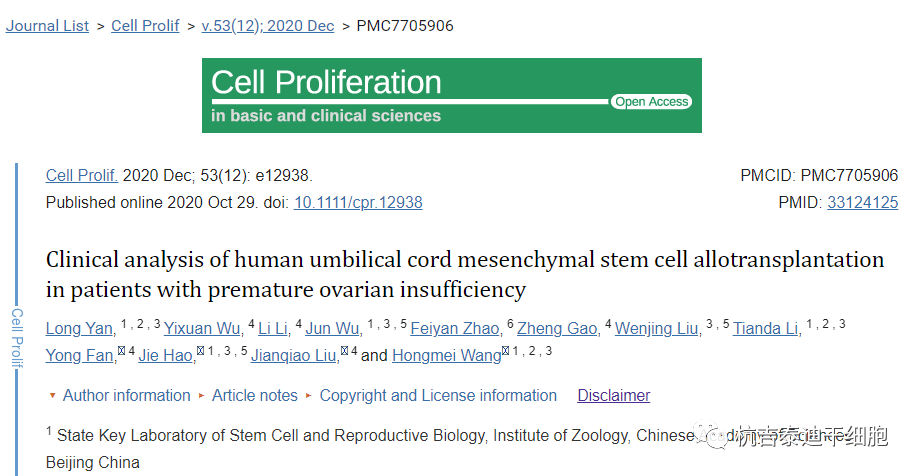 人脐带间充质干细胞治疗卵巢早衰的临床案例2020年,中国科学院动物研究所干细胞与生殖生物学国家重点实验室在《Cell Prolif》杂志上发表了关于人脐带间充质干细胞治疗卵巢早衰的临床案例分析的文章。该临床试验表明,脐带间充质干细胞移植可改善卵泡生长,尤其是在移植前闭经时间较短的患者中。该疗法有效地挽救了卵巢功能,没有出现严重的不良事件。