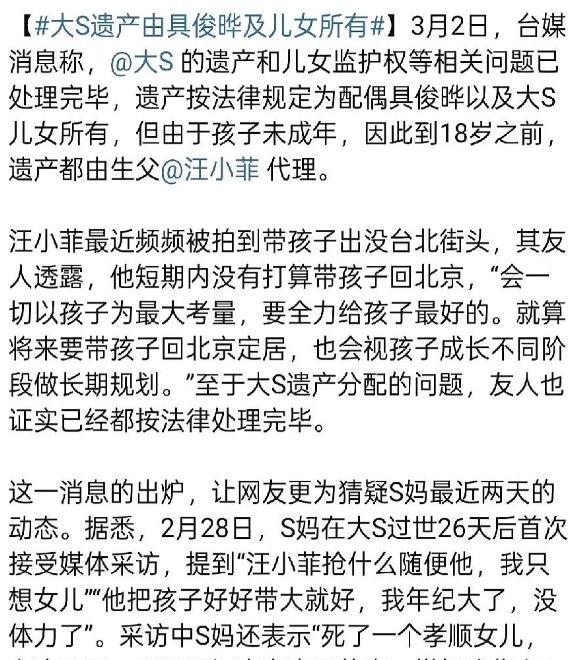 大S的离世,给她的家人和朋友带来了无尽的悲伤,也引发了公众对遗产分配、家庭关系以及人性的诸多思考。徐家和汪家的纠纷始于离婚,终于遗产,这其中展现了人性的复杂和多面性。